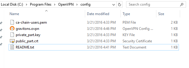 You need to download the file gravitons.ovpn and put it in the configuration directory of OpenVPN which is C:\Program Files\OpenVPN\config by default. After opening the file, you need to change the values of the dev-node, ca, cert and key options to use the proper interface and certificate. It is recommended to put the certificate files in the directory where the configuration file is.