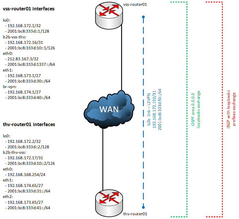 The new infrastructure will rely on OSPF and BGP protocols. It is quite obvious that OSPF will be used as IGP so to route at the minimum routers loobpacks between them. In this way each router will know the others thanks to OSPF. BGP will be used in its external version to begin with: eBGP. This is currently in production since Gravitons has joined GLaNET. Each peering is based on a BGP session.